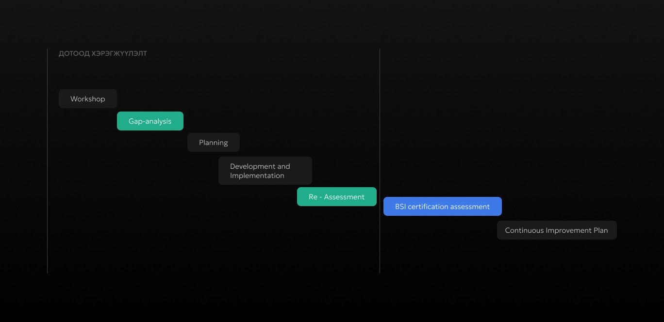 Олон улсын ICXI институт, бүсийн түнш CMI болон төсөл нэвтрүүлэгч байгууллагаас бүрдсэн төслийн баг бүрдүүлэх ба, төсөл дунджаар 3-6 сар үргэлжлэх 7 үе шаттай